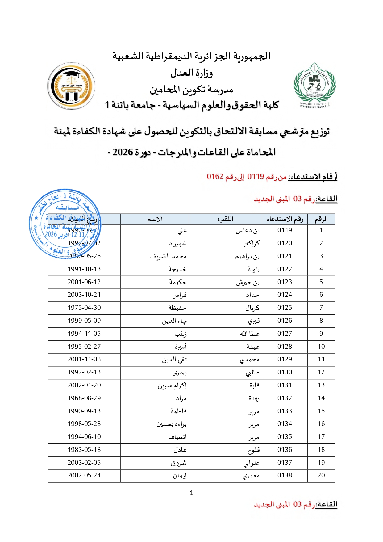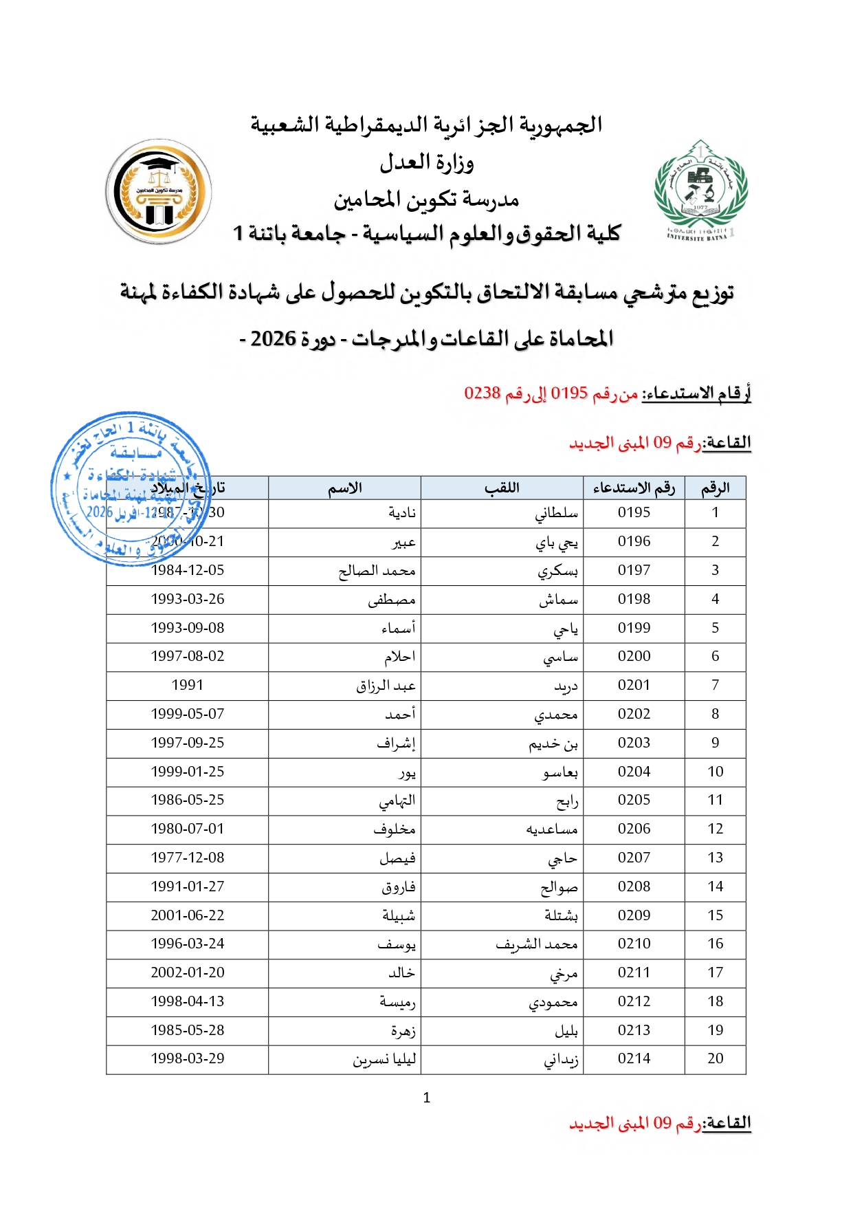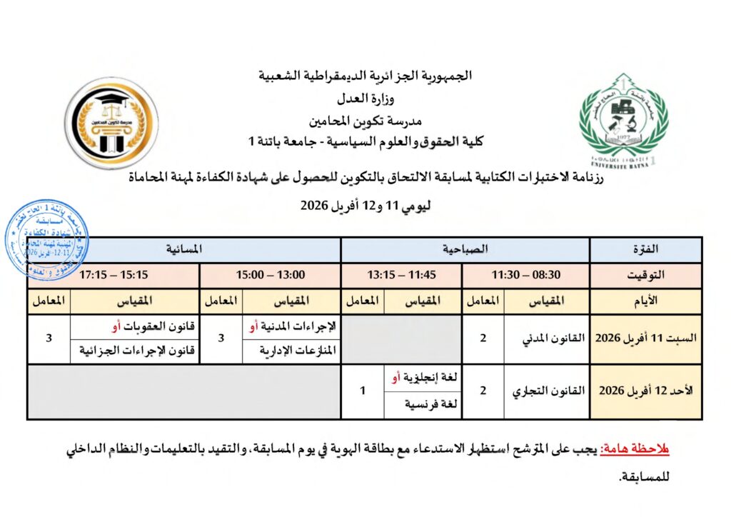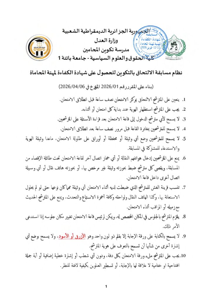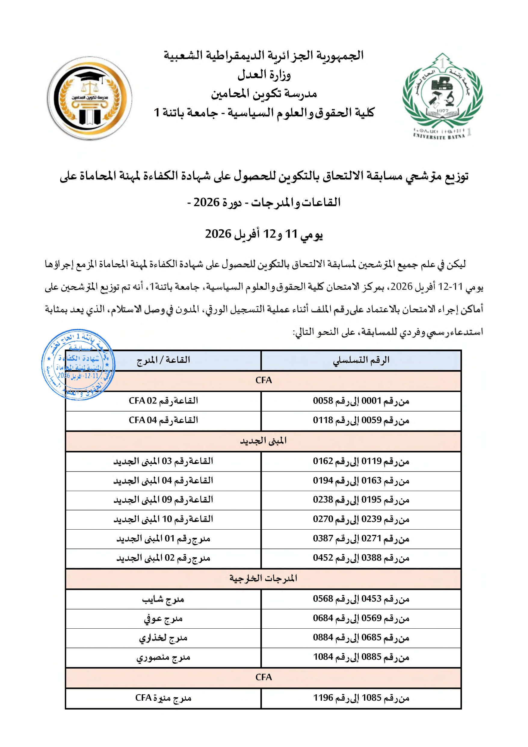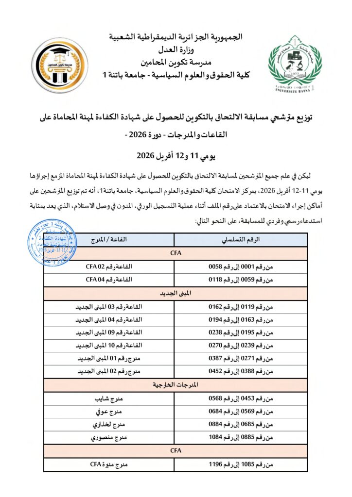 توزيع مترشحي مسابقة الالتحاق بالتكوين للحصول على شهادة الكفاءة لمهنة المحاماة على القاعات و المدرجات – دورة 2026 –