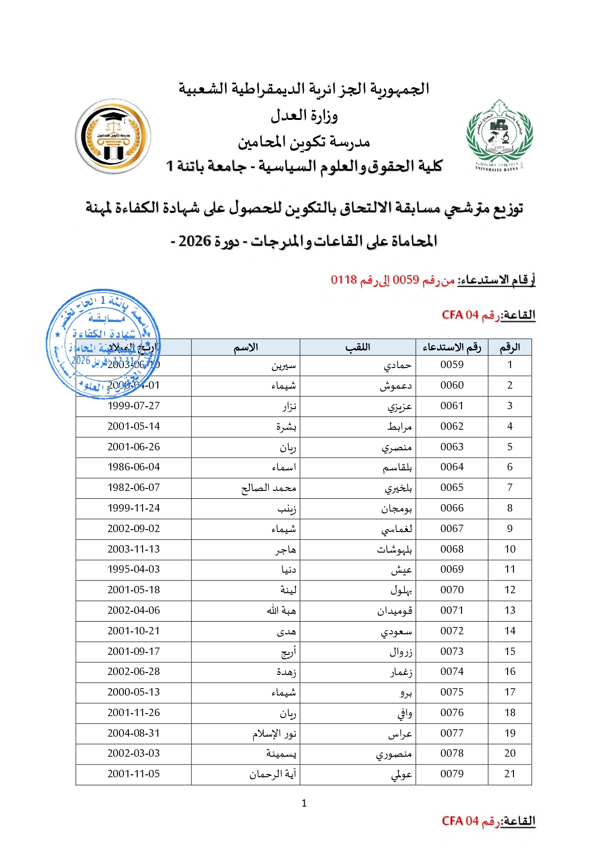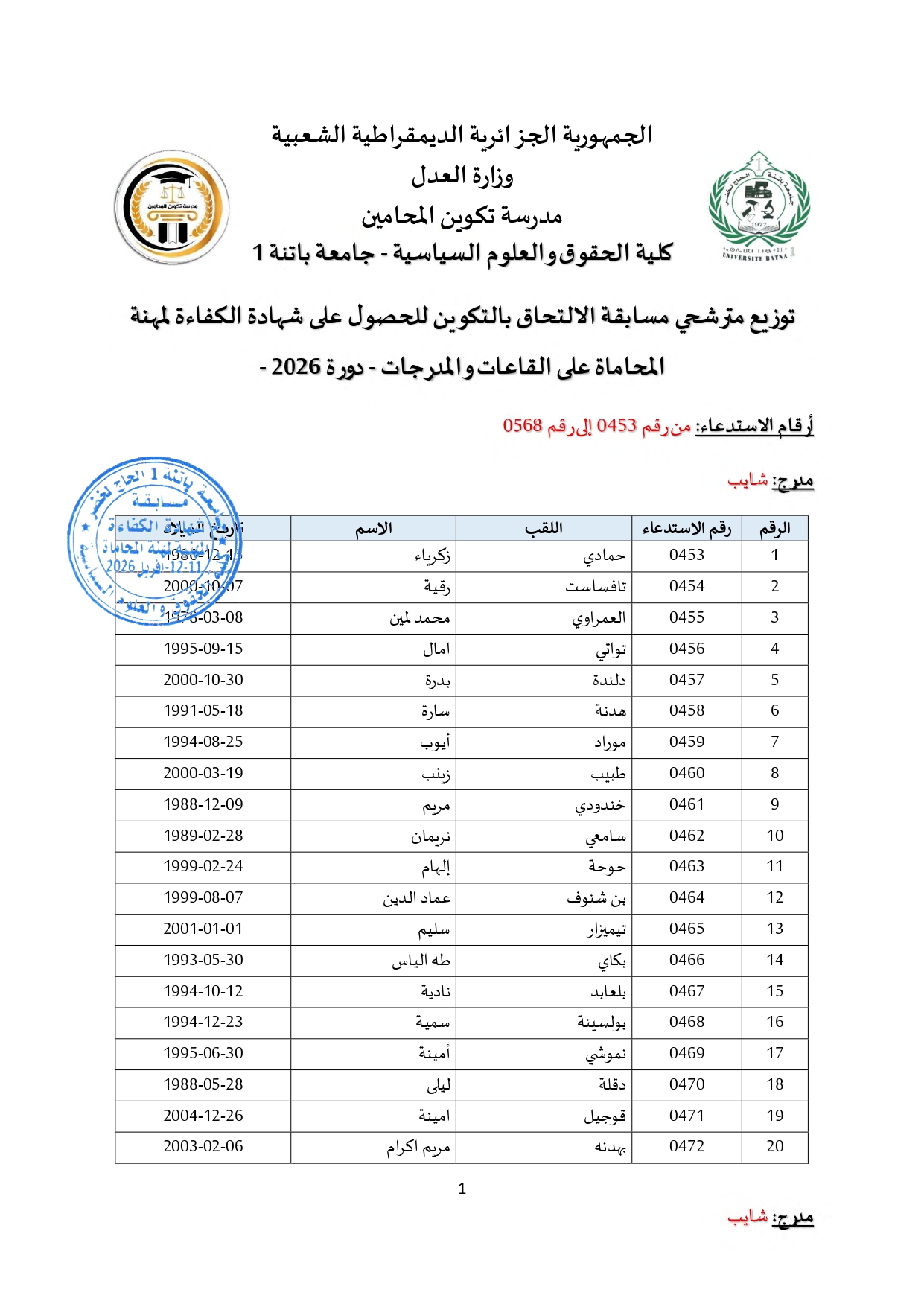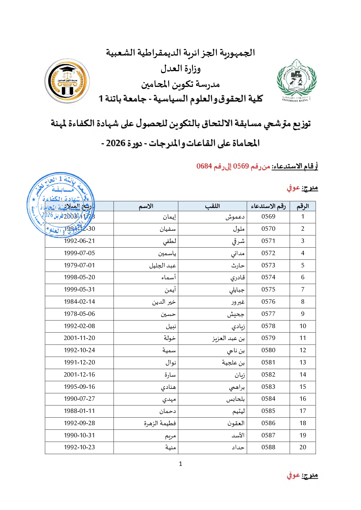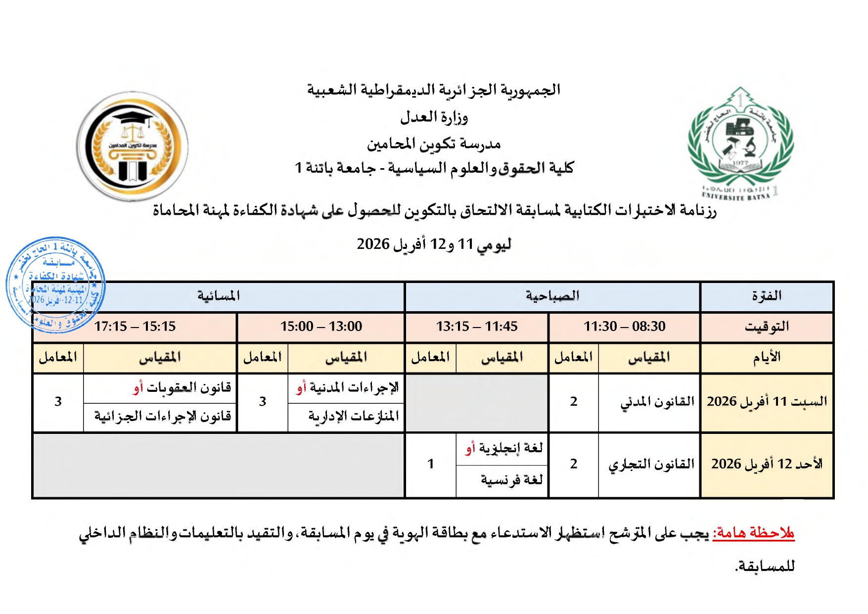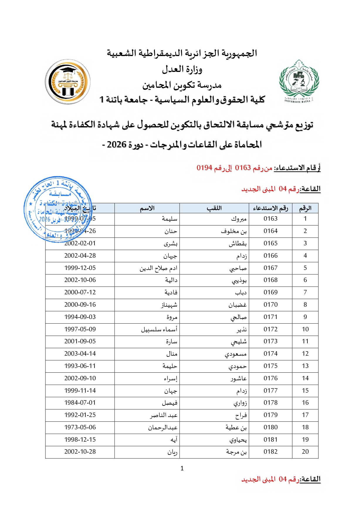 توزيع مترشحي مسابقة الالتحاق بالتكوين للحصول على شهادة الكفاءة لمهنة المحاماة على القاعات و المدرجات – دورة 2026 –