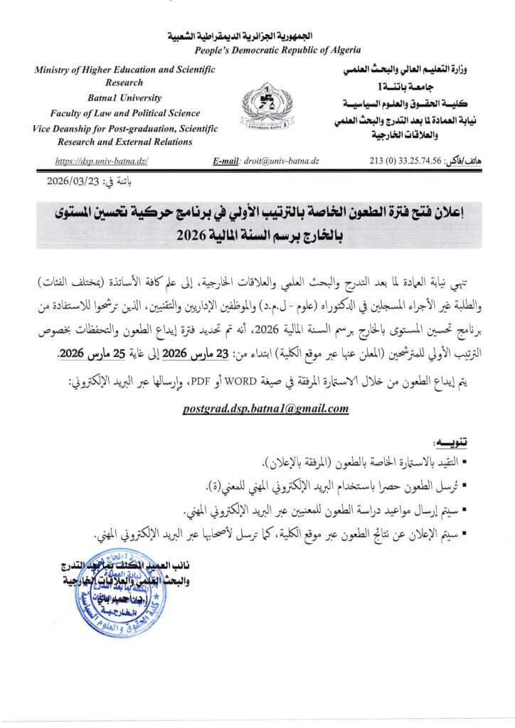تحميل استمارة الطعون الترتيب الأولي للمترشحين – قسم القانون العام- فئة الأساتذة 2026Download الترتيب الأولي للمترشحين – قسم القانون الخاص- فئة الأساتذة 2026Download الترتيب الأولي للمترشحين – قسم العلوم السياسية- فئة الأساتذة 2026Download الترتيب الأولي للمترشحين – الطلبة الباحثين وغير الأجراء- 2026Download الترتيب الأولي للمترشحين – الإداريين والتقنيين 2026Download